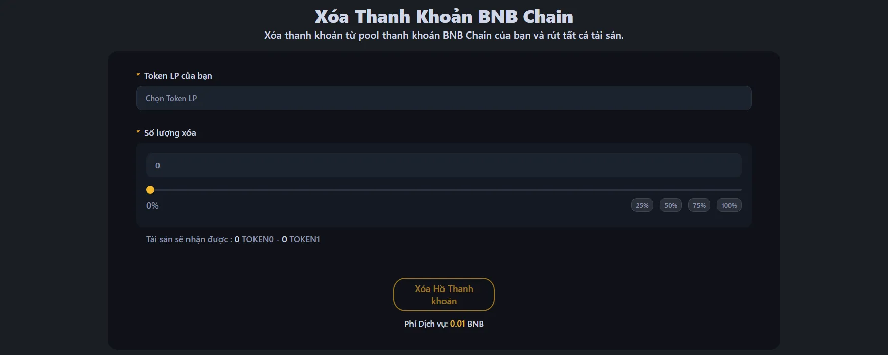 Để rút thanh khoản từ pool token BNB Chain, hãy truy cập công cụ rút thanh khoản BNB Chain và kết nối ví chứa token LP hoặc vị thế NFT của bạn.