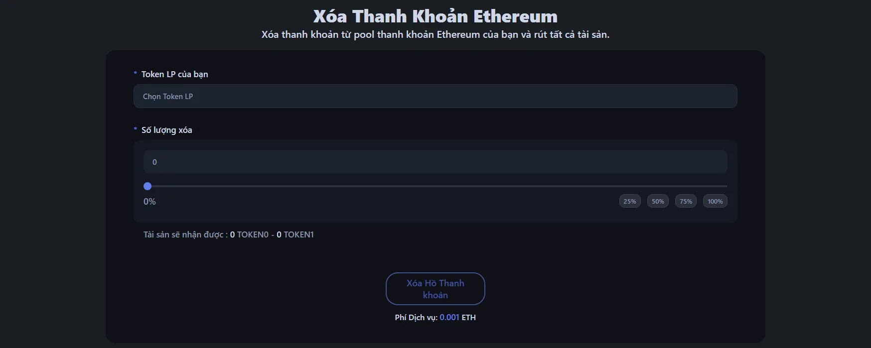 - Chọn lượng thanh khoản cần rút: bạn có thể rút 25%, 50%, 75% hoặc 100%.