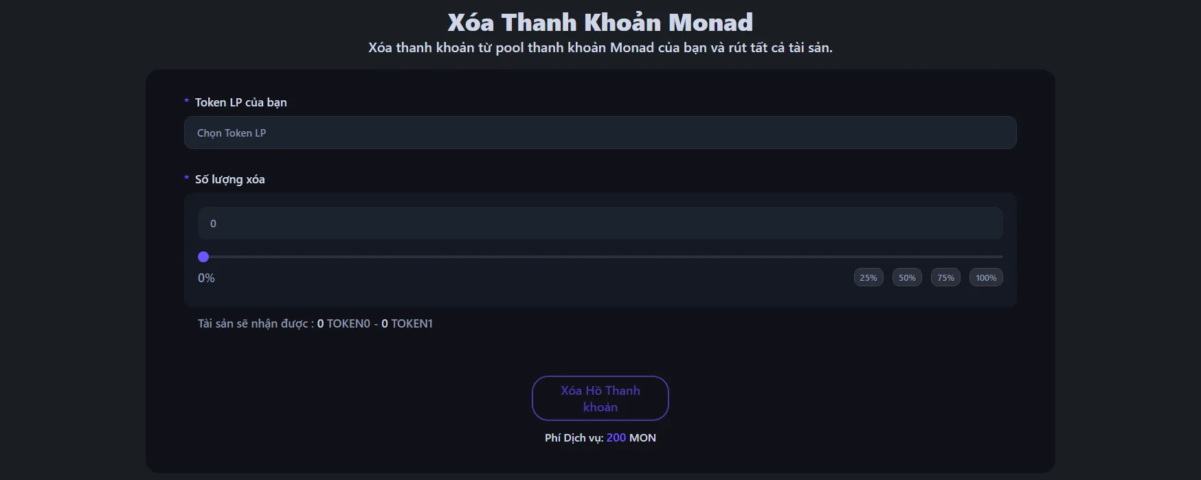 Để rút thanh khoản từ pool token Monad, hãy truy cập công cụ rút thanh khoản Monad và kết nối ví chứa token LP hoặc vị thế NFT của bạn.