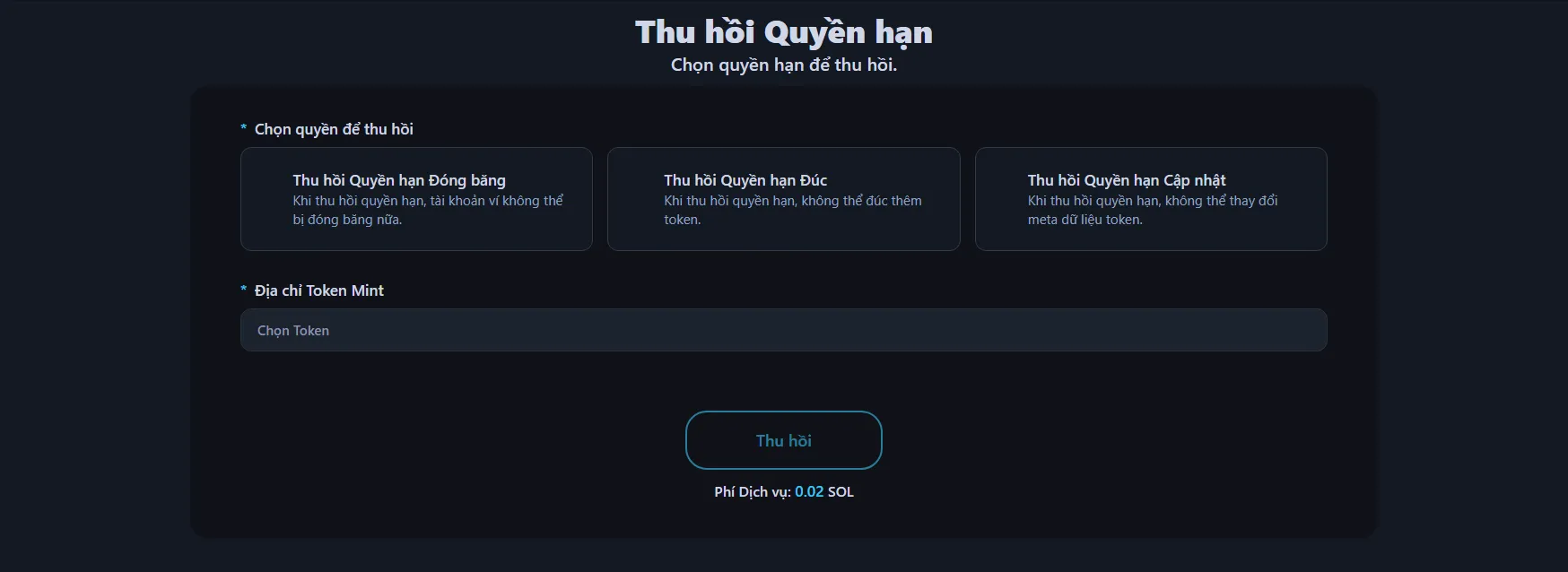Chi phí: Miễn phí khi tạo token. Token đã tồn tại: 0.02 SOL mỗi lần thu hồi.