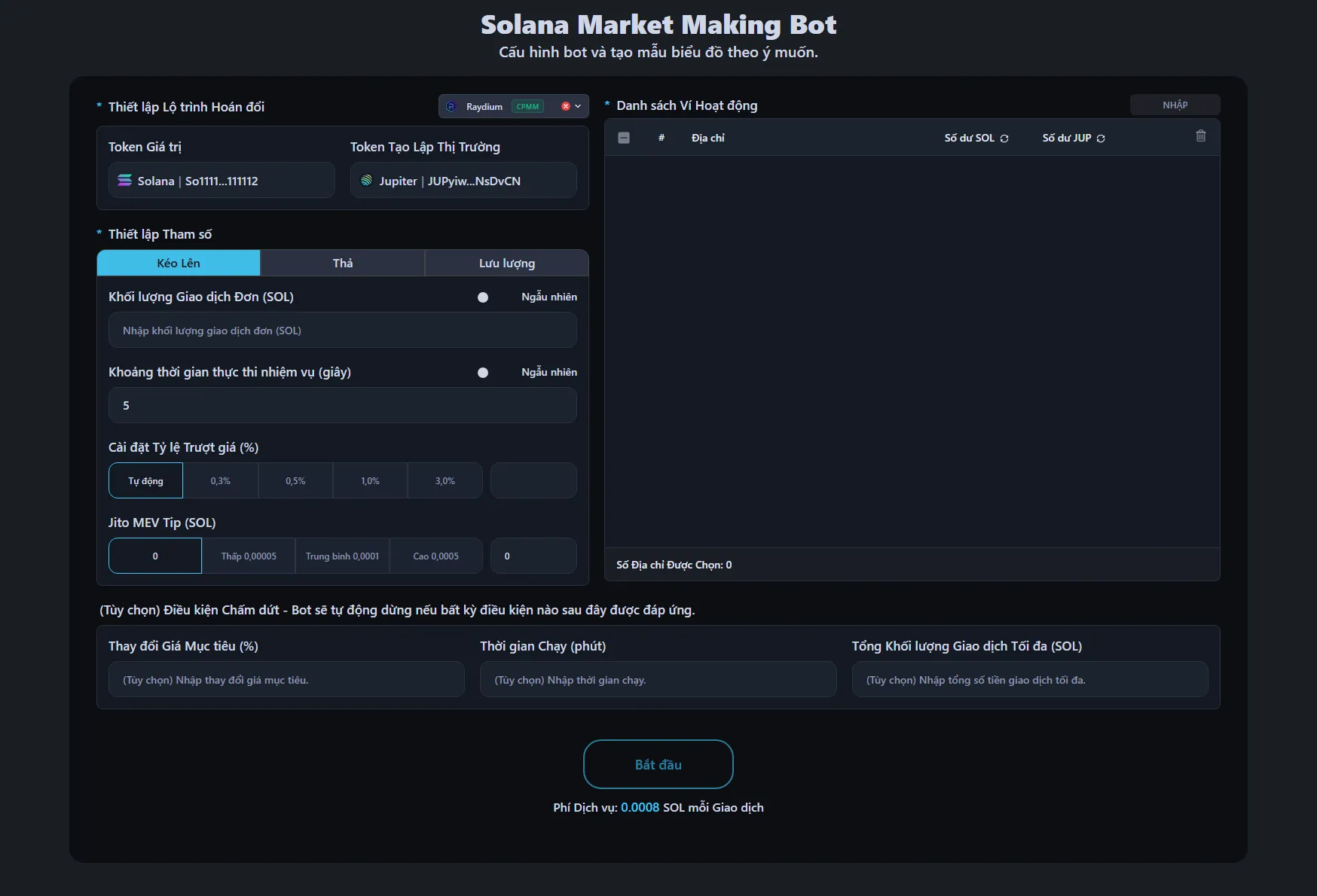 Để xem mô tả chi tiết các tham số và hướng dẫn thiết lập kỹ thuật, hãy xem Tài liệu Bot Market Making Solana của chúng tôi.