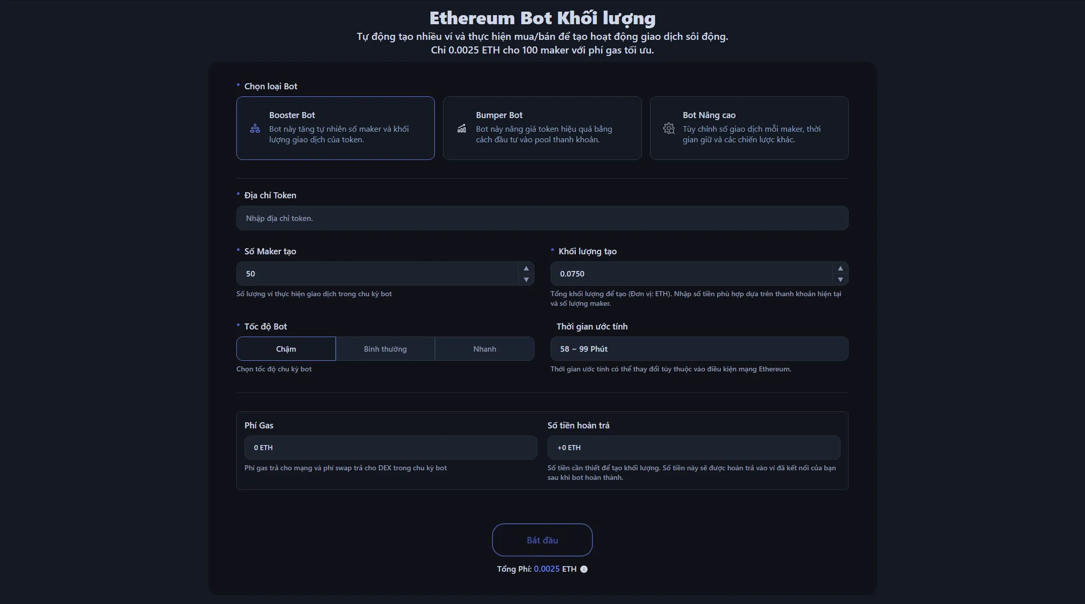 - Điều Chỉnh Cài Đặt: Đặt số lượng maker, khối lượng giao dịch hoặc ETH để bơm vào pool thanh khoản, và tốc độ bot.