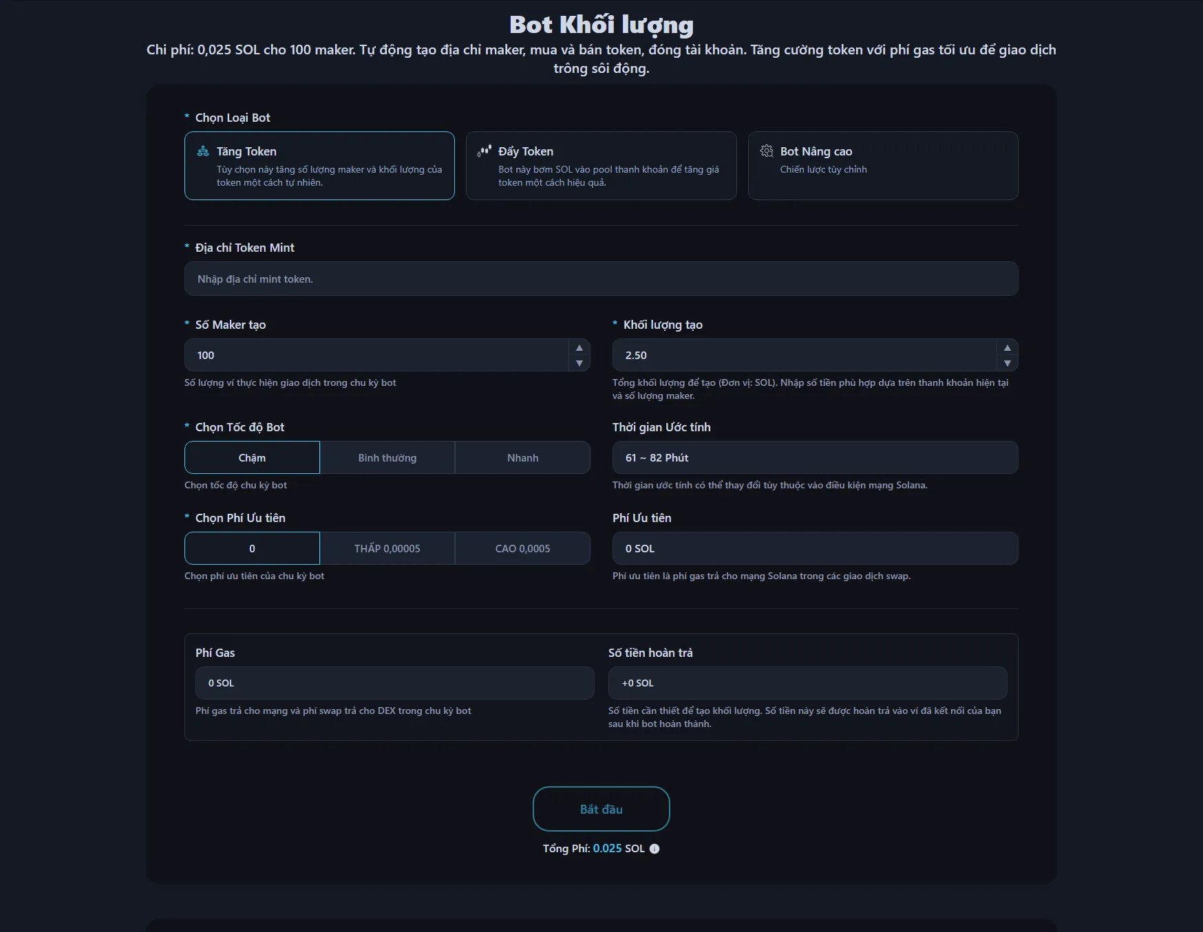 Tất cả chi phí bổ sung bao gồm phí gas, phí swap DEX và SOL cần cho tạo volume được tự động tính và hiển thị trước khi thanh toán. Bạn thấy bao nhiêu trả bấy nhiêu. Mọi thứ ngoài phí dịch vụ được hoàn lại sau khi chu kỳ kết thúc.