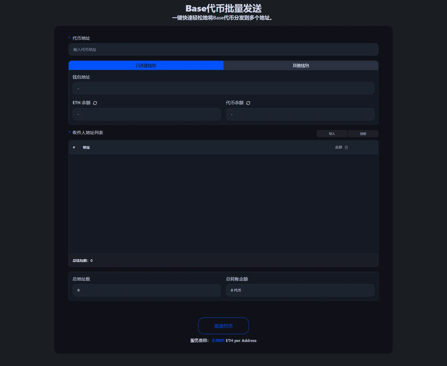 服务费为每个收件人地址0.0001 ETH。例如,向100个钱包发送代币,服务费为0.01 ETH,加上标准BaseGas费。