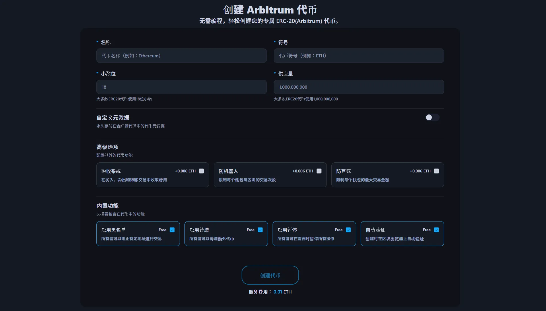此dApp完全符合Arbitrum(ERC-20)标准,该标准旨在解决以太坊的可扩展性问题,以低费用和快速处理速度著称。除了简单的代币创建外,您可以自由配置详细选项以匹配您项目的特点。