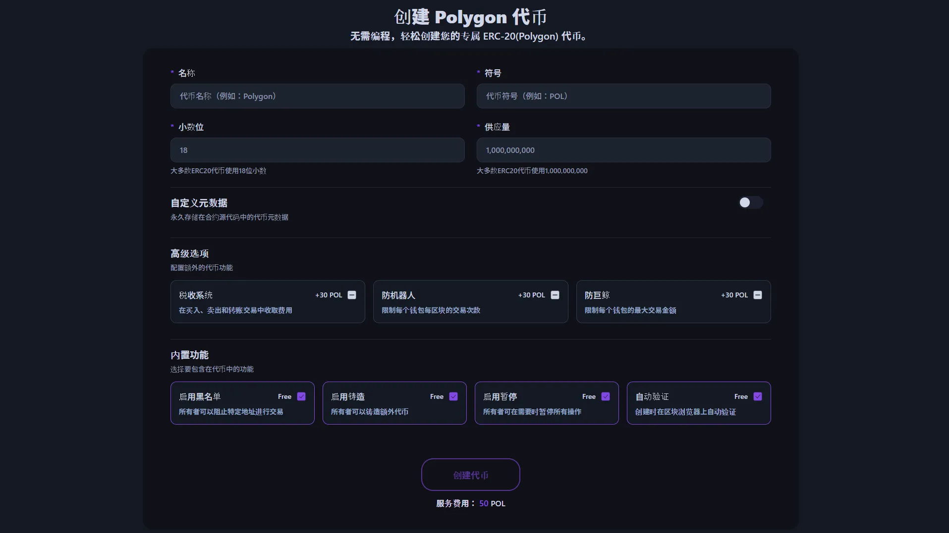 此dApp完全符合Polygon(ERC-20)标准,该标准旨在解决以太坊的可扩展性问题,以低费用和快速处理速度著称。除了简单的代币创建外,您可以自由配置详细选项以匹配您项目的特点。