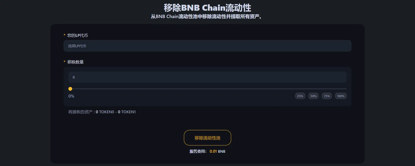 要从BNB链代币池移除流动性,请前往BNB链流动性移除工具,连接持有LP代币或NFT仓位的钱包。