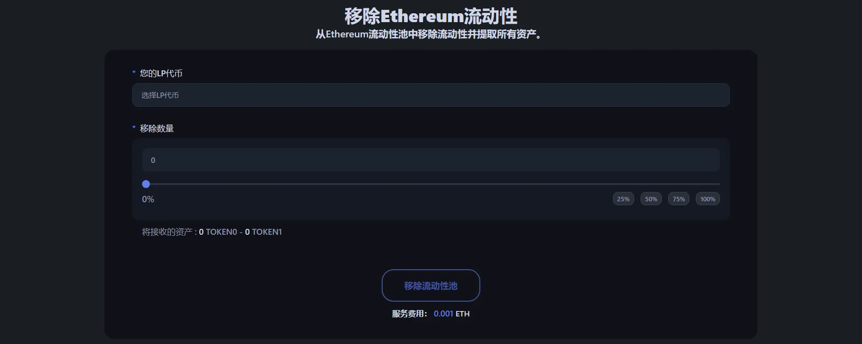 要从以太坊代币池移除流动性,请前往以太坊流动性移除工具,连接持有LP代币或NFT仓位的钱包。