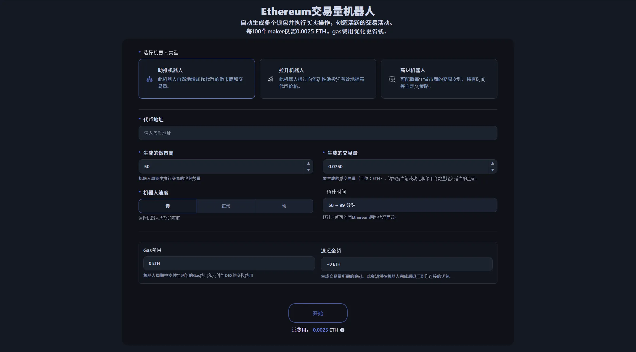 每100个做市商0.0025 ETH,不按交易量额外收费。Gas费和DEX交换费用会在启动前计算并显示,以优化后的金额执行。您还可以查看完成后将退还的ETH数量。