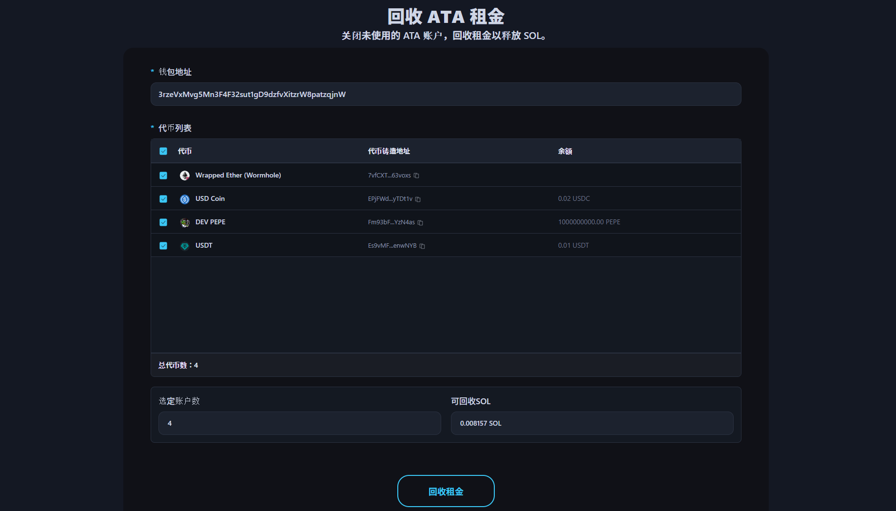 - 进入 批量回收 ATA 租金 / 批量回收 Pump.Fun PDA 页面