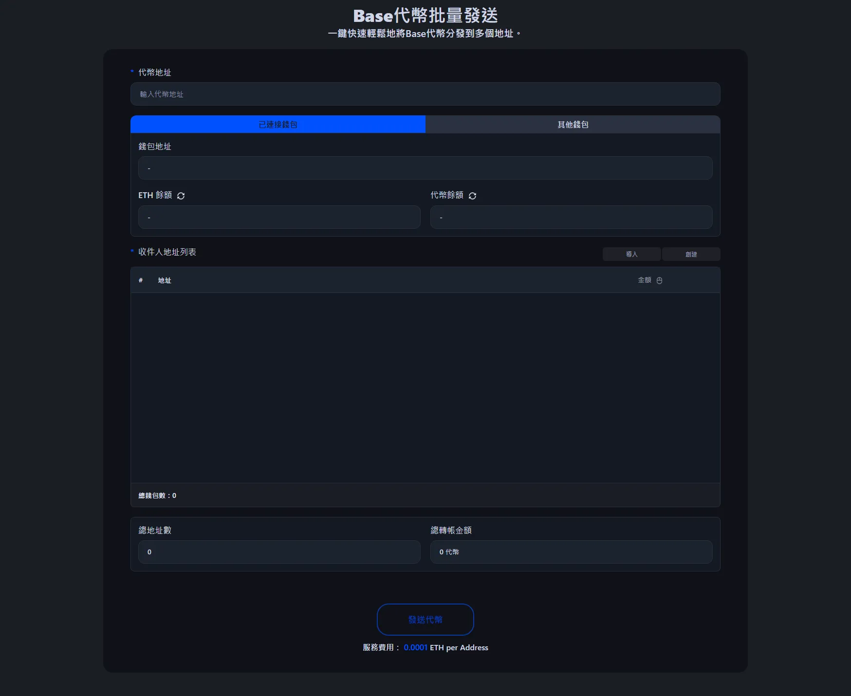 服務費為每個收件人地址0.0001 ETH。例如,向100個錢包發送代幣,服務費為0.01 ETH,加上標準BaseGas費。