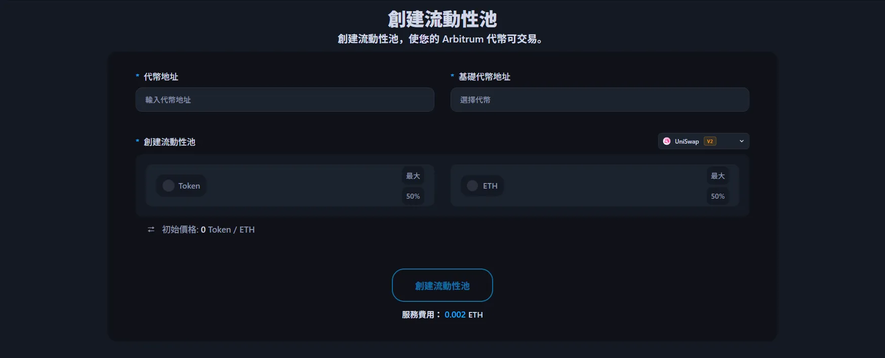 使用Alphecca的服務費為0.002 ETH,Gas費用很少。沒有其他額外費用。但您需要自行準備用於流動性池的代幣和配對代幣(ETH、USDT等)。Arbitrum是以太坊Layer 2網路,Gas費用非常低,因此創建流動性池非常經濟實惠。