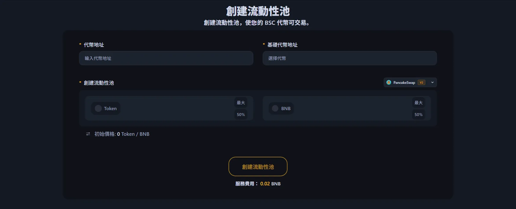 要為您的BNB鏈代幣創建流動性池,請前往BNB鏈流動性池創建工具(https:/