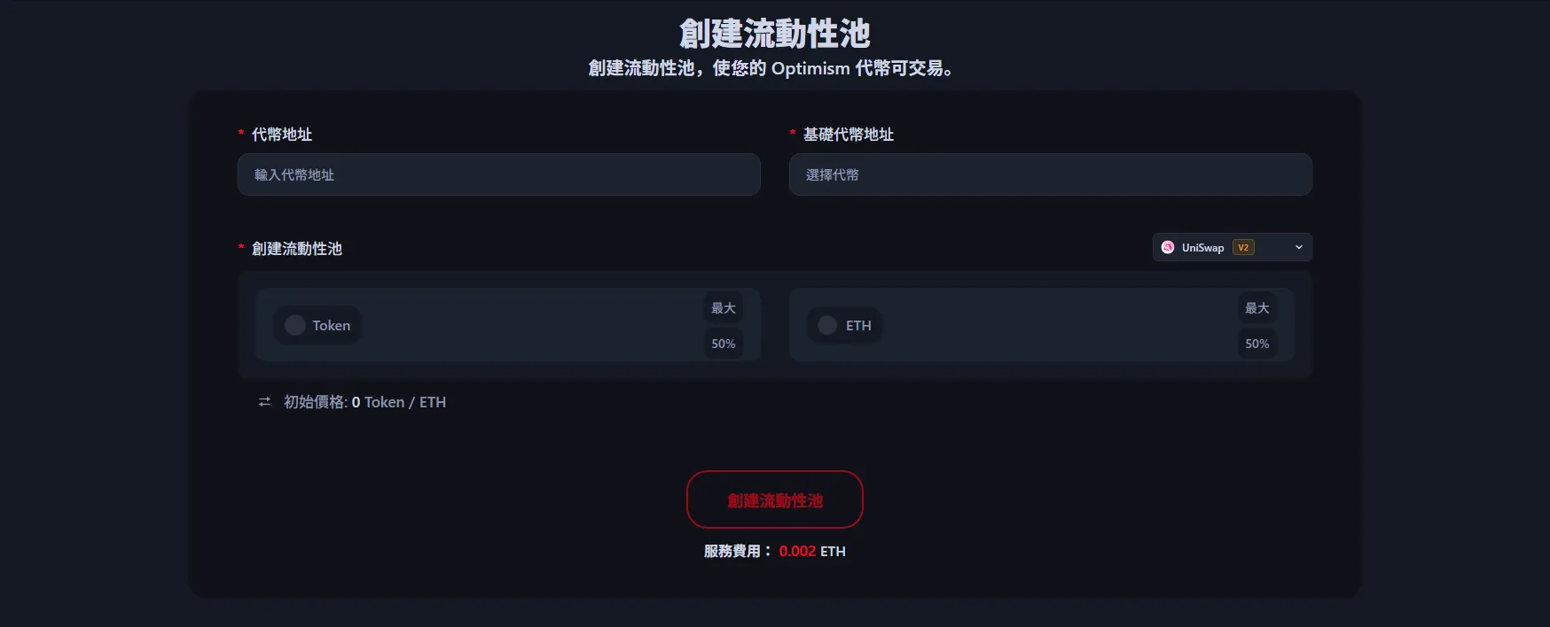 使用Alphecca的服務費為0.002 ETH,Gas費用很少。沒有其他額外費用。但您需要自行準備用於流動性池的代幣和配對代幣(ETH、USDT等)。Optimism是以太坊Layer 2網路,Gas費用非常低,因此創建流動性池非常經濟實惠。