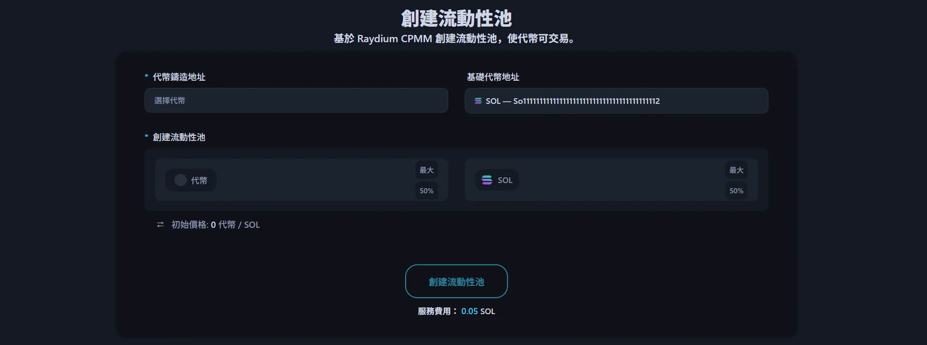 - 輸入要添加為流動性的代幣數量和SOL數量。這將設定代幣的初始價格。