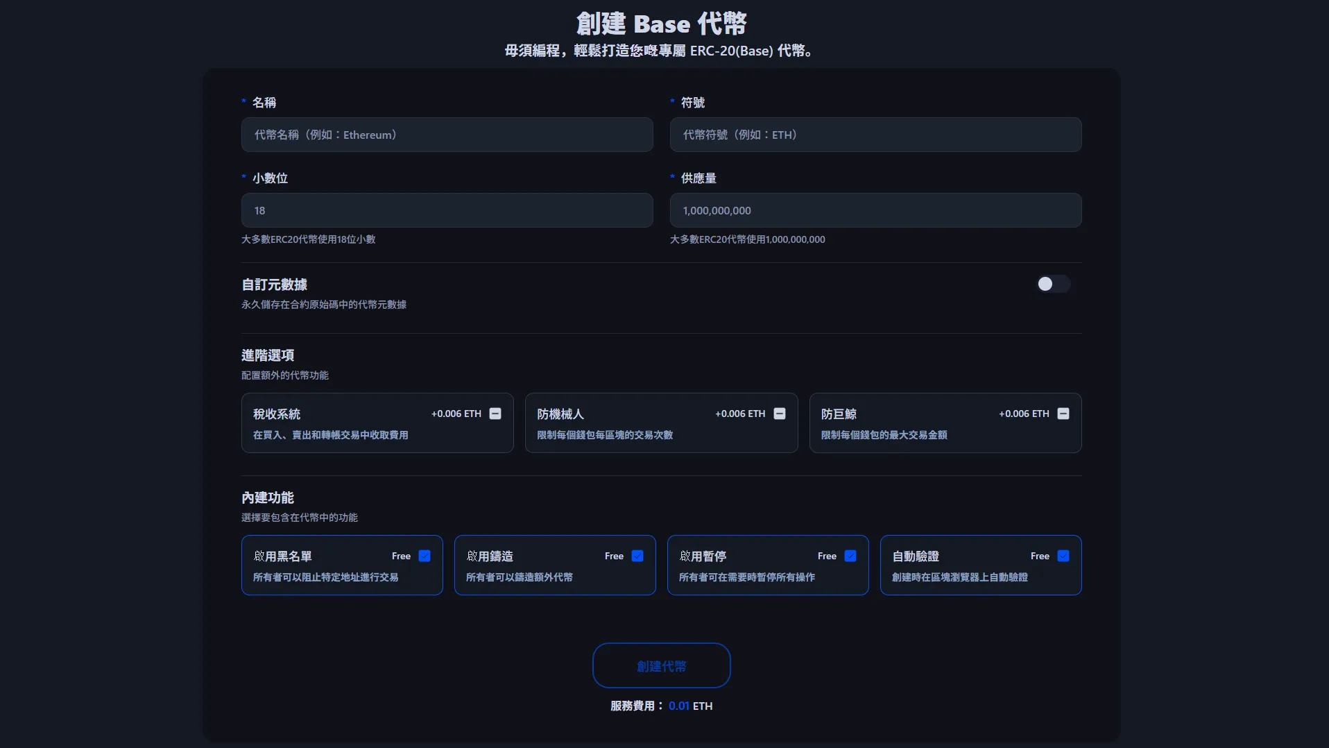 此dApp完全符合Base(ERC-20)標準,這是Coinbase開發的以太坊Layer 2解決方案,以低費用和快速處理速度著稱。除了簡單的代幣創建外,您可以自由配置詳細選項以匹配您項目的特點。