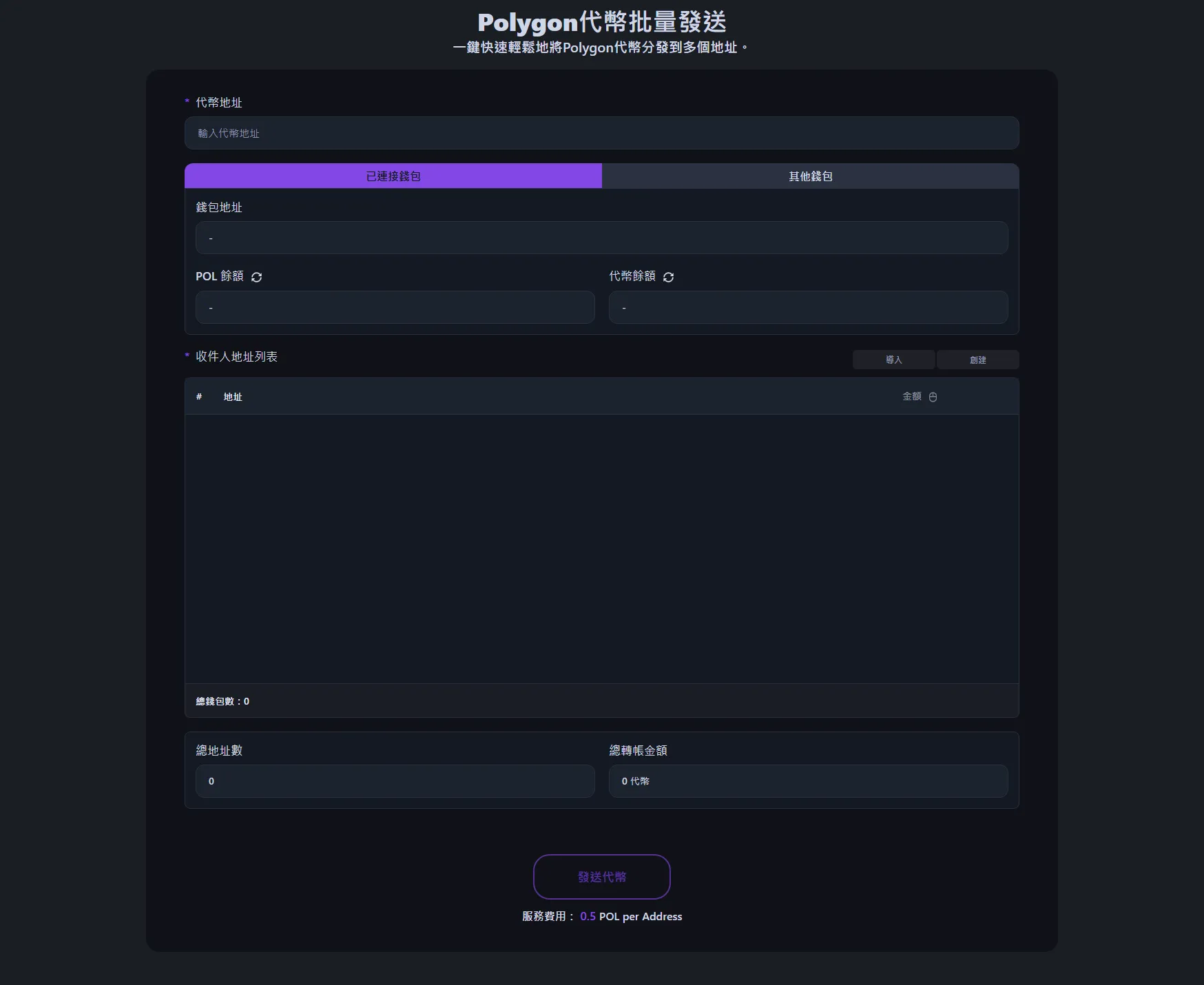 服務費為每個收件人地址0.5 POL。例如,向100個錢包發送代幣,服務費為50 POL,加上標準PolygonGas費。