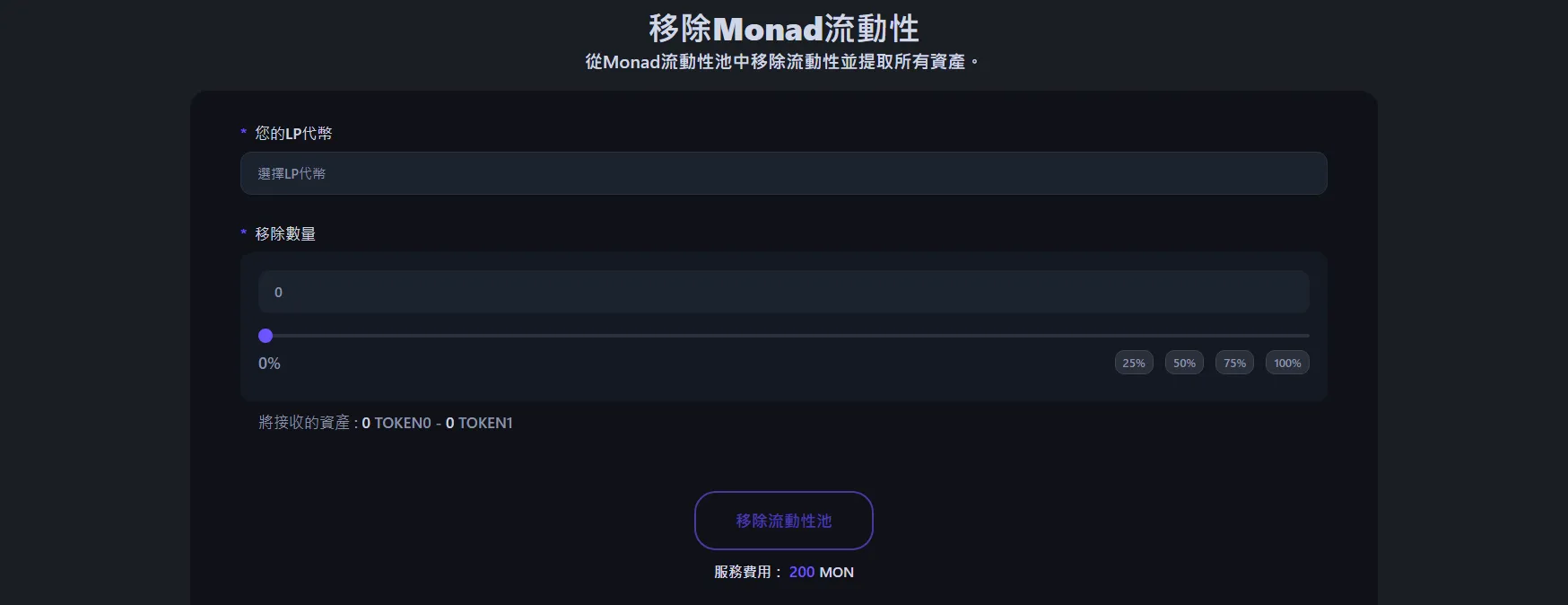要從Monad代幣池移除流動性,請前往Monad流動性移除工具,連接持有LP代幣或NFT部位的錢包。