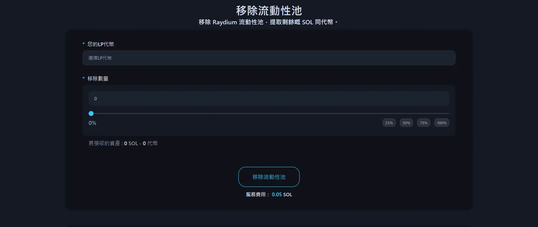 費用:0.05 SOL 每次移除的固定服務費,另加標準Solana網路Gas費。