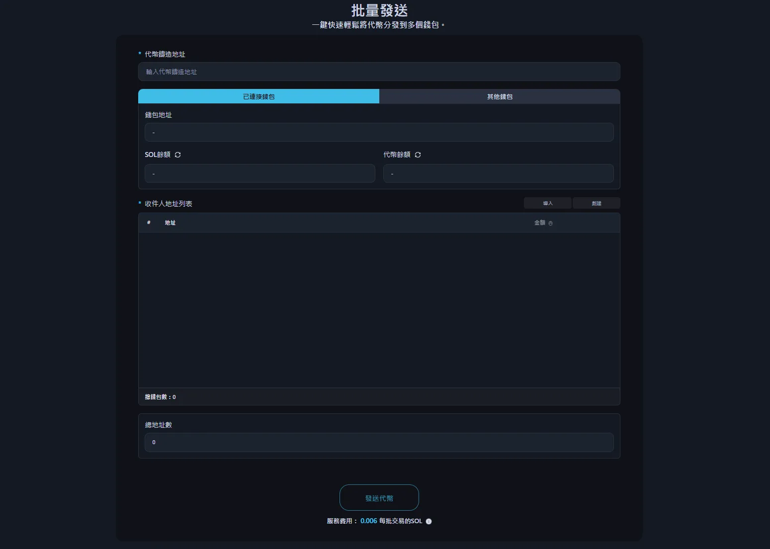 每批次交易0.006 SOL——這是服務費。另加標準Solana網路Gas費(每筆交易不到一分錢的零頭)。