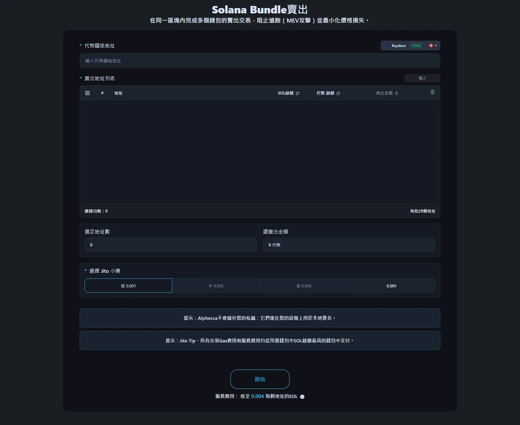 捆綁賣出支援Raydium、Pump.Fun、PumpSwap等主要Solana DEX。單個捆綁交易最多可包含29個錢包。